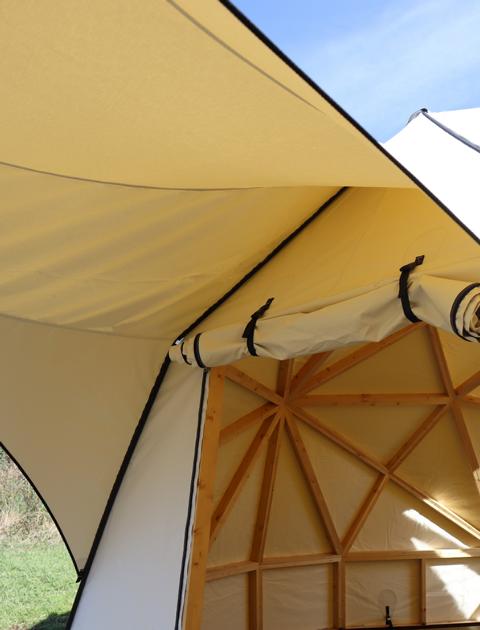 Mit 19 m² Fläche und 3,5 m Raumhöhe bietet der Dome Platz für 2 Erwachsene und 1 Kind – offen, hell und besonders. Die großzügige Fensterfront, das sichtbare Holzgerüst aus Fichte und die wetterfeste Zelthaut sorgen für Komfort und Ästhetik. Optionales Zubehör wie Plattform, Schraubfundamente und lösbare Steckverbinder erweitern den Einsatzbereich – saisonal oder ganzjährig.